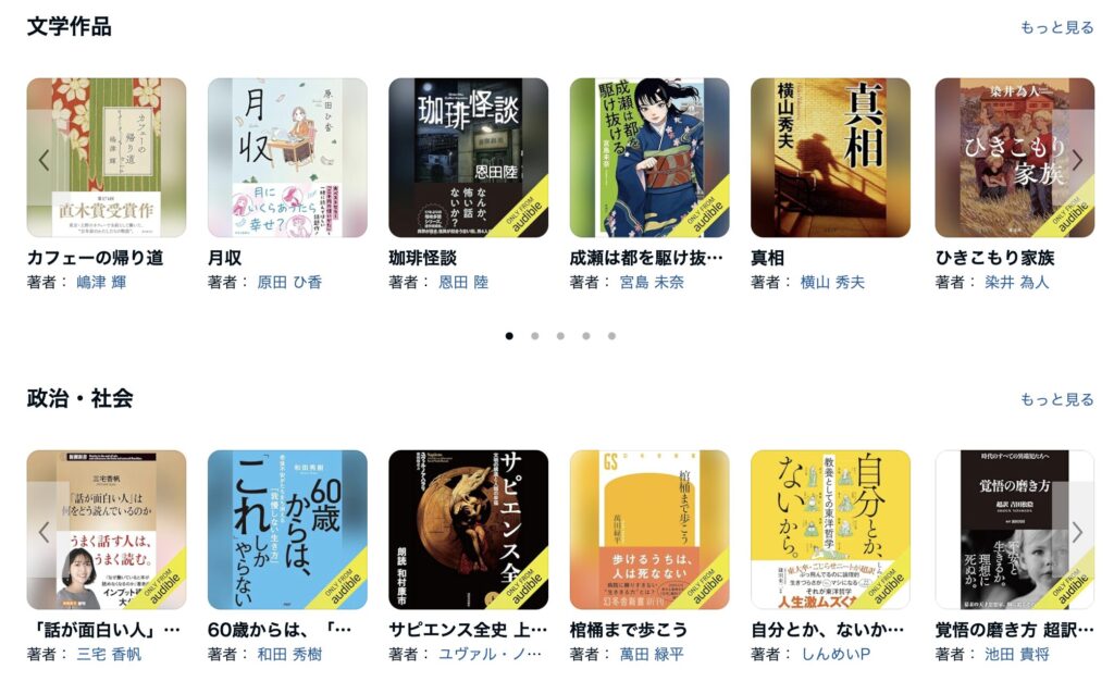 以下は、Audible公式サイトの「人気タイトル」です。