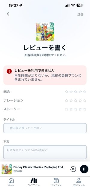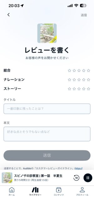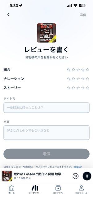 なぜなら、一定時間聴かないとレビューが書けないからです。